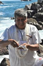 The 16th annual Feria Maestros del Arte, which took place in Chapala this past weekend, was “an unparalled opportunity to learn about the process, value, and meaning of generations-old Mexican folk art.” The most fascinating of all the enchanting things I learned about was Tixinda, an ancient purple dye. This dye, which requires no additional chemicals to set permanently, is milked from the nearly extinct purpura panza mollusk, a snail in a handsome shell that lives only in a deep bays along the coast of Oaxaca. The milking must be done right where the snails live; otherwise the dye does not ‘paint’ the hand-spun skein of cotton thread. And the snails are then immediately returned to the sea, alive!